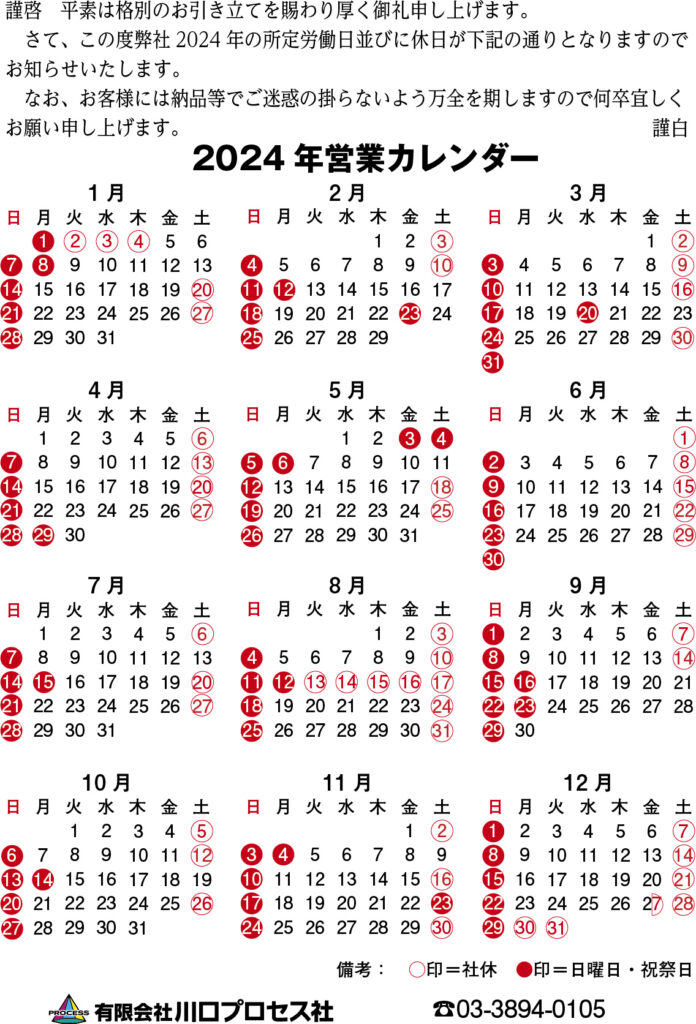 2024年 営業カレンダー